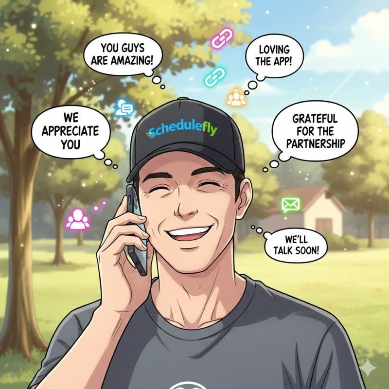 "Hey Wil, it’s (Name) from (very large Schedulefly customer). Tag, you’re it! Just kidding.
